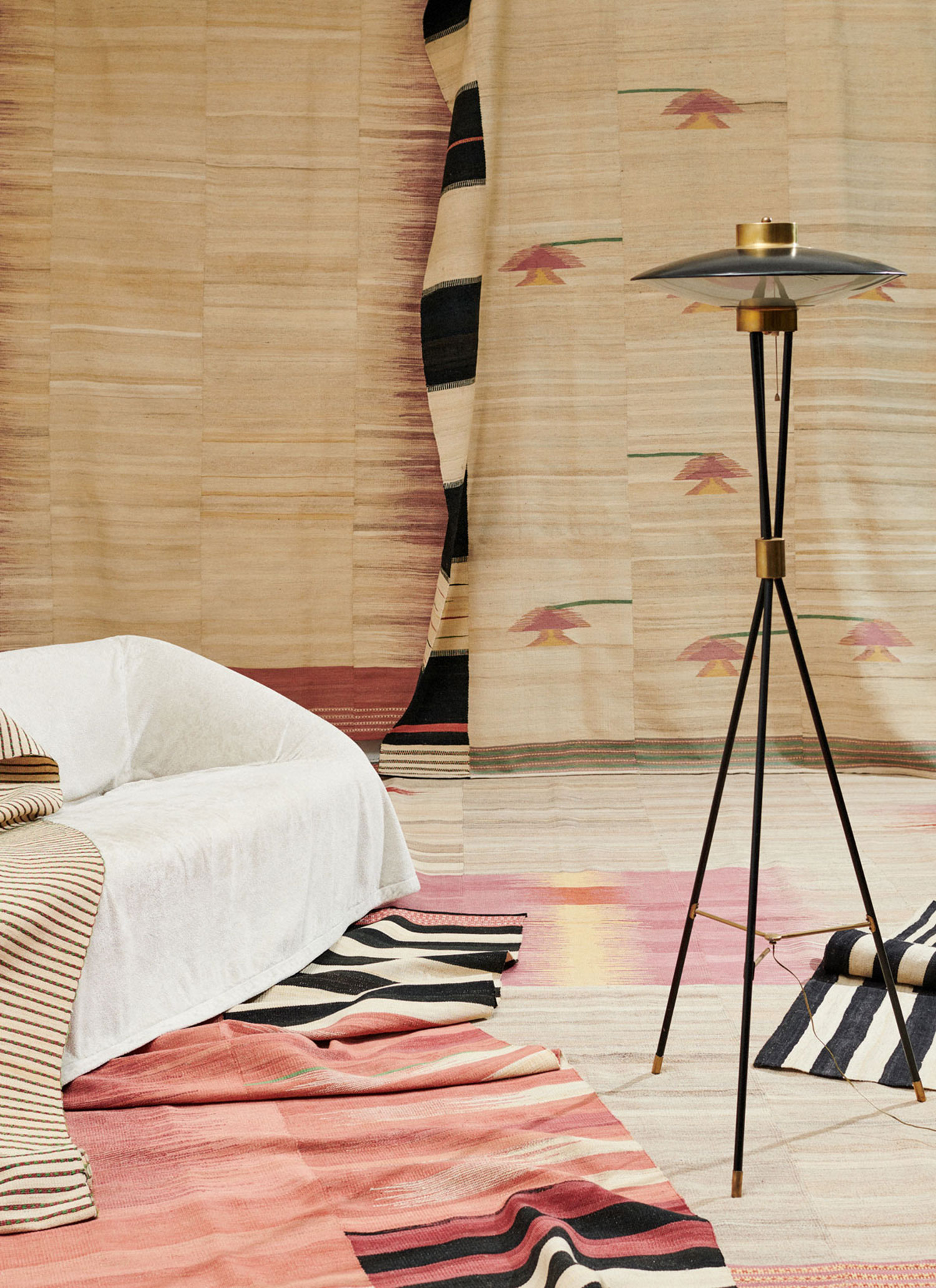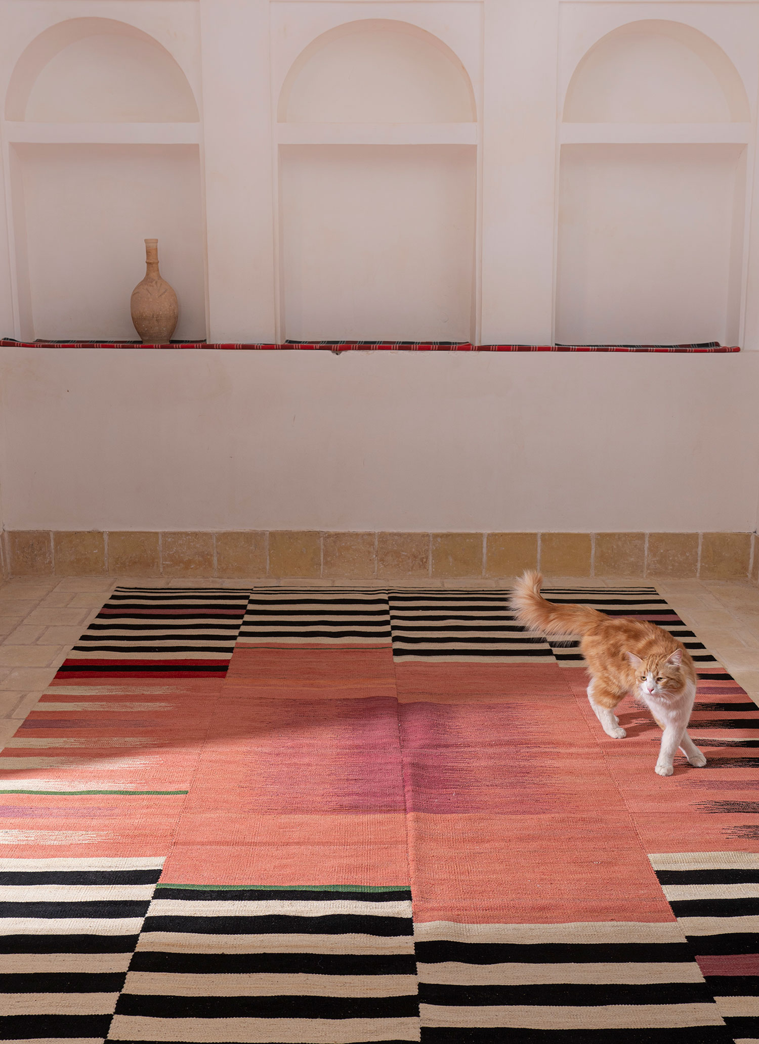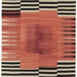 The highly detailed designs are reminiscent of abstract modernist paintings, constructed as a series of vertical panels. Individually woven by hand on narrow wooden looms, the panels are meticulously sewn together to create infinitely varied patterns. These dense flat-weave kilims are of the highest quality, ensuring their durability and longevity. Edelgrund’s signature hand-embroidered borders give the Alasht collection a refined elegance.