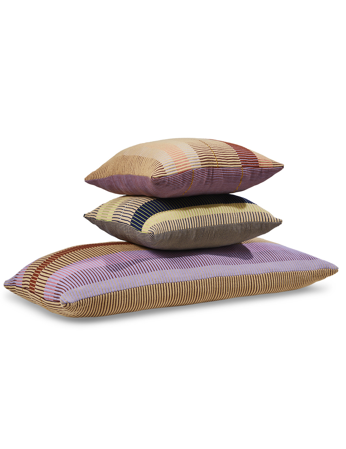 Designed by Mae Engelgeer, the Chumbes cushion collection takes inspiration from the Chumbe Inga, a traditional Colombian garment with characteristic symbols. Comprising of scattered cushions and floor cushions, the Chumbes collection is handmade using natural cotton and fine metallic yarns. The ribbed structures create a unique graphic composition that follows a deeply rooted weaving technique specific of the Sibundoy region.