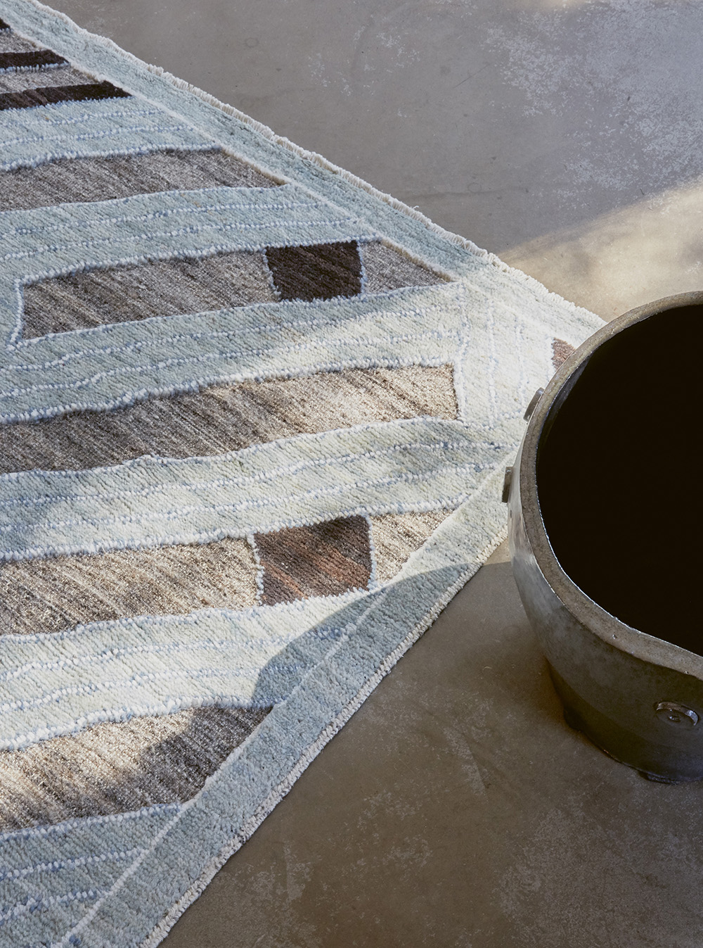 Crafted to improve with age and develop a patina in the tradition of antique carpets. The unique designs in this collection stem from an exploration of African culture and the shapes and colours found in its traditional textiles. Designed by Jawed Ahmadi, the compositions are mostly inspired by Kuba cloth; commonly produced in the Democratic Republic of Congo and typically characterised by vast and varied abstract geometric designs.