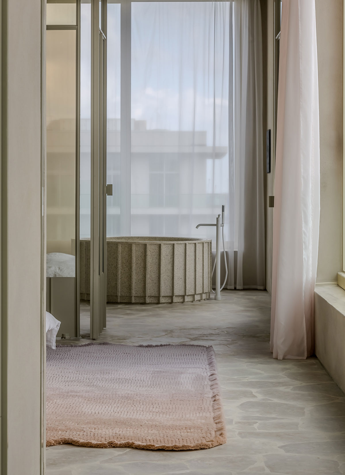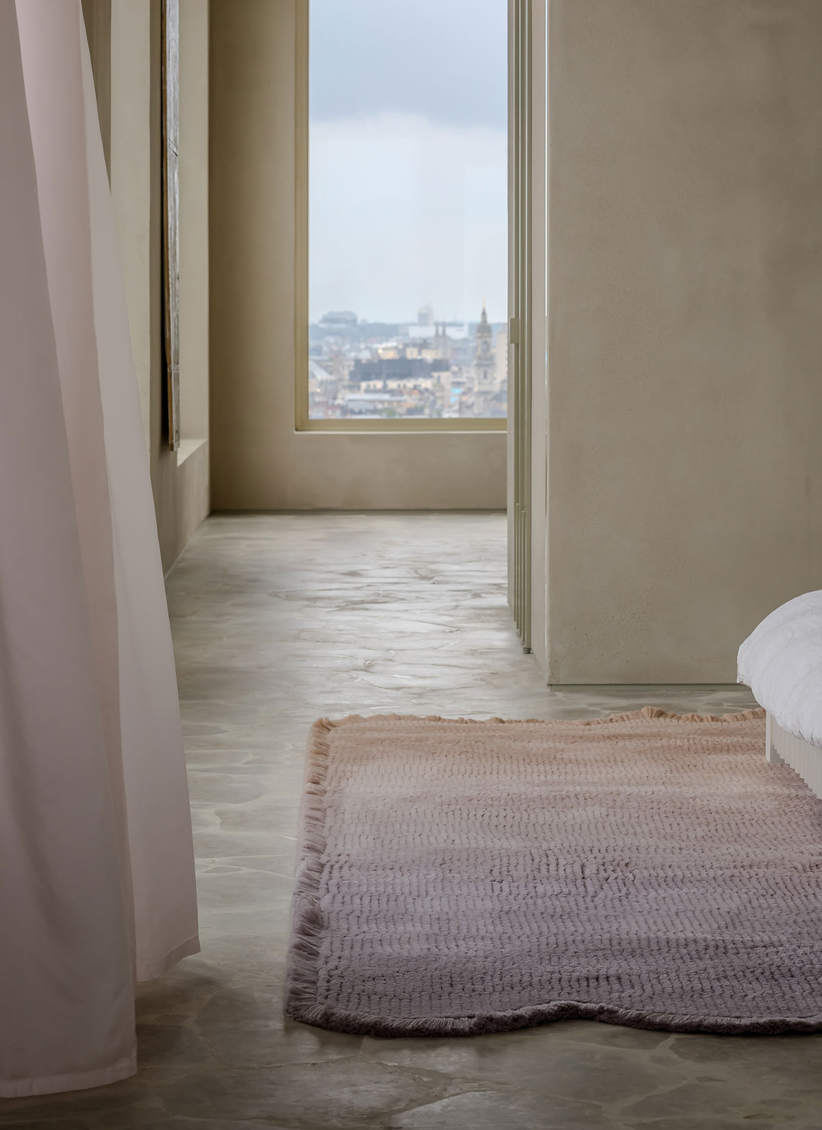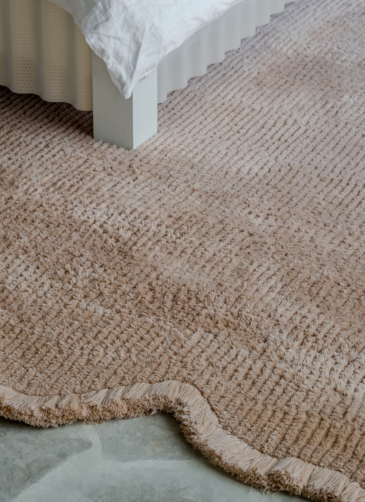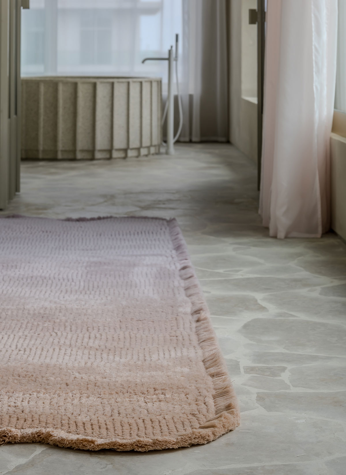 The Daydream rug from JOV’s Prismatic Cascade series explores soft movement through colour and form. A gentle gradient flows across its surface, framed by curved edges and tonal fringe. Handcrafted with pure New Zealand wool, Daydream has a warm, matte texture that brings quiet tactility and refinement to an interior. Its design can be tailored in size, shape, and colour, allowing it to adapt while preserving its essential character. The result is a piece that feels both sculptural and calm.