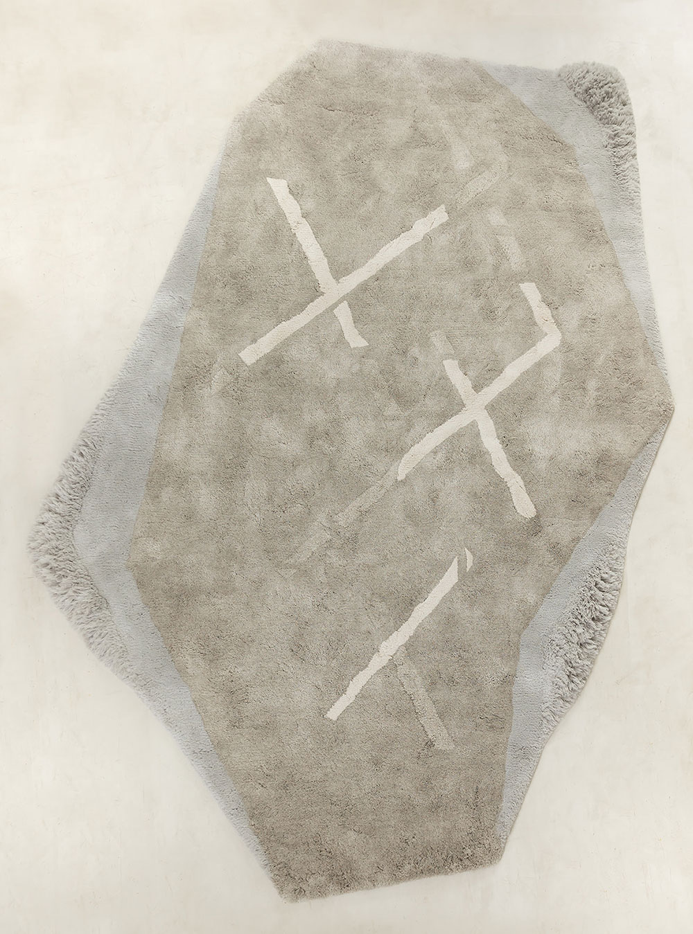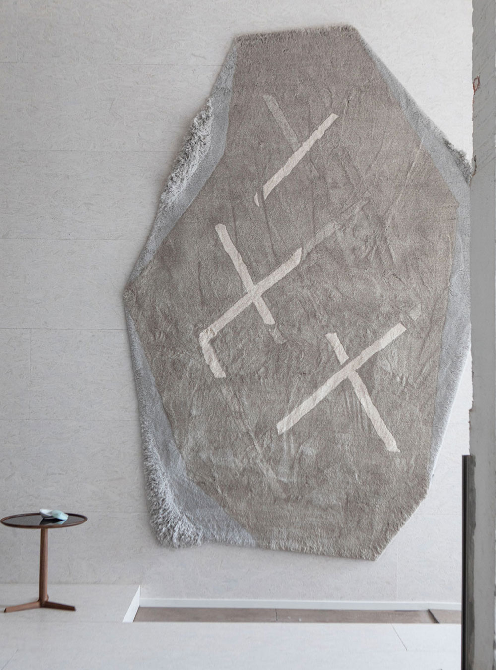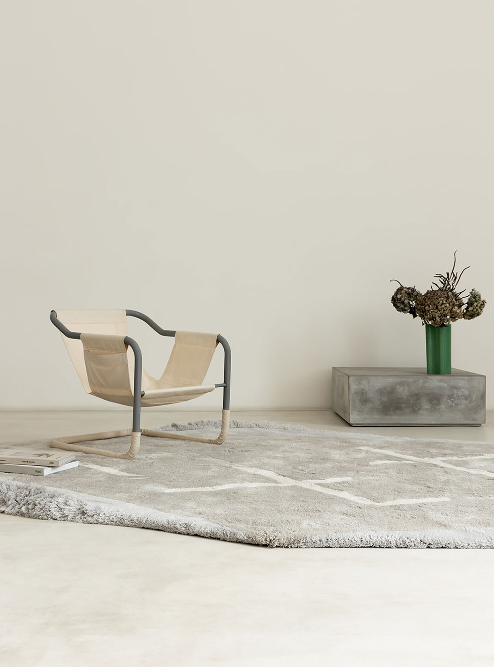 Designed and developed in Belgium by JOV, Faded is as much a statement for the wall as it is for the floor. Challenging the formal concept of the rectangular rug, Faded features an erased diamond pattern in neutral tones, highlighted by the subtle movement and sheen of Belgian linen, merino wool and cotton. The angular edges are further accentuated by shaggy areas, fading out gradually into the design.