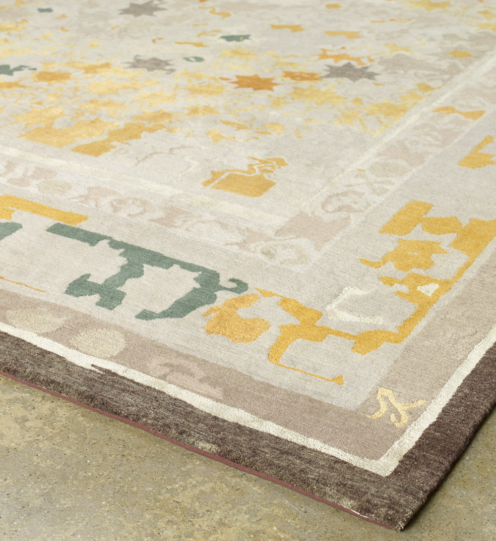 Karaoke Gold is part of Reuber Henning’s ‘Lost in Translation’ collection, inspired by the movie of the same name. The colourful lights of Tokyo, among which Scarlett Johansson and Bill Murray lose themselves in the film, form the backdrop for this collection. Designs in the collection such “Karaoke Gold” , “Whisper” and “Lights” are based on crucial scenes in the film and are a nod to old 19th century rugs from Anatolia. The reinterpretation of traditional elements in a modern style results in rugs with a classical background and surprising patterns and colour combinations. Reaching well beyond their origins, they have an expression and appearance of their own. All designs focus on the star, symbol of justice, protection and guidance.