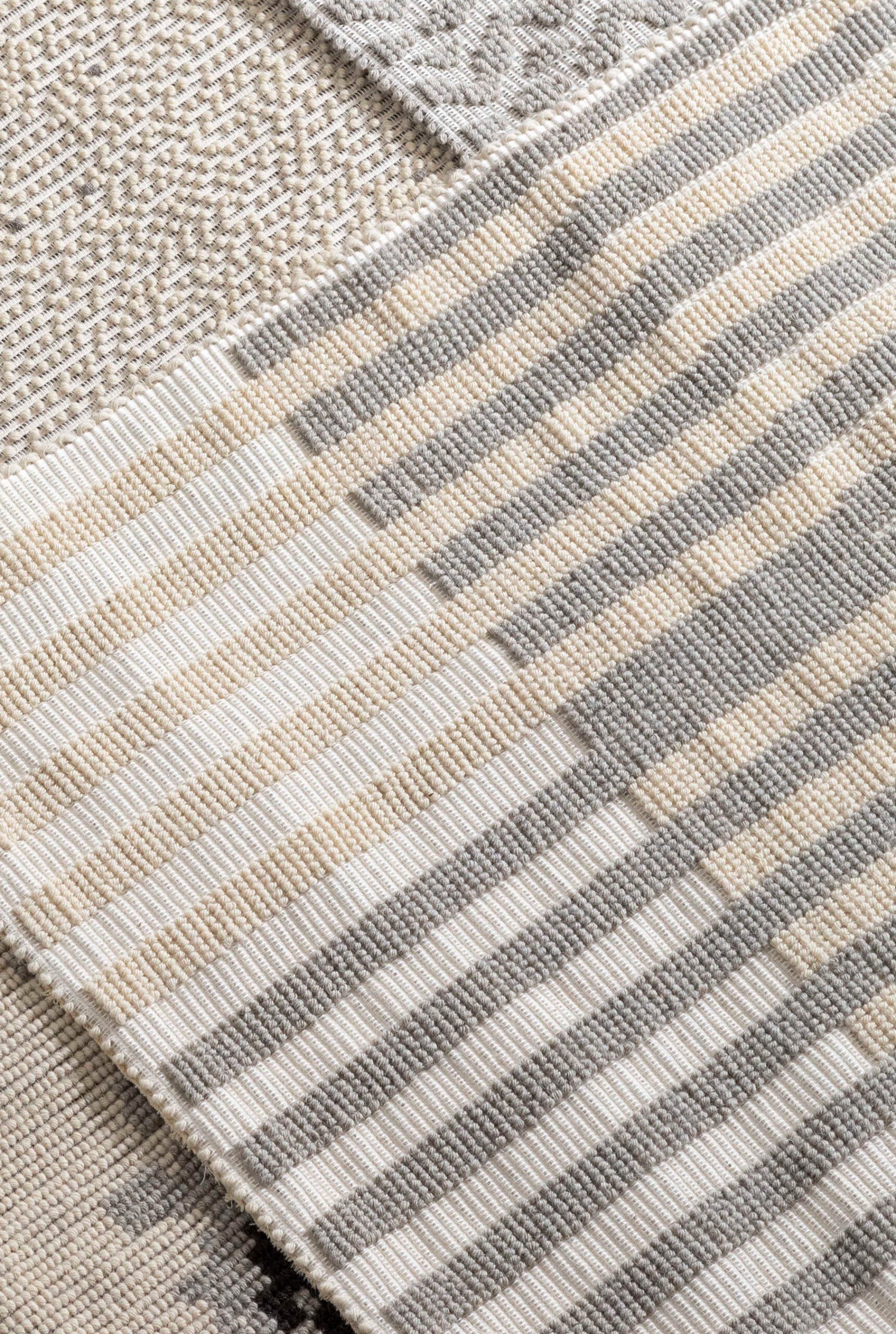 Part of the Tinto in Pecora collection and designed by Angelika Rösner for Mariantonia Urru, Linea uses both colour and weaving to form a fluctuating surface akin to an optical illusion. Accentuated by natural shades of grey wool and a high/low texture, the rhythmic stripe design appears to float above the ground.