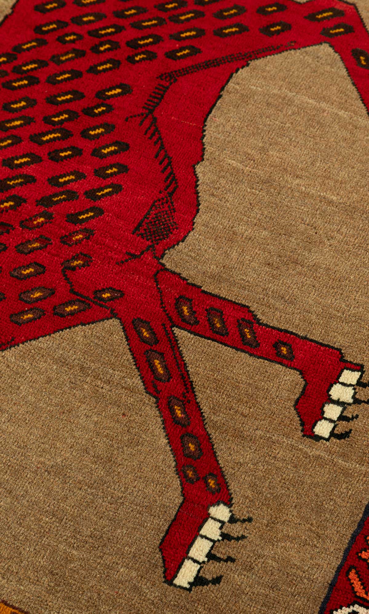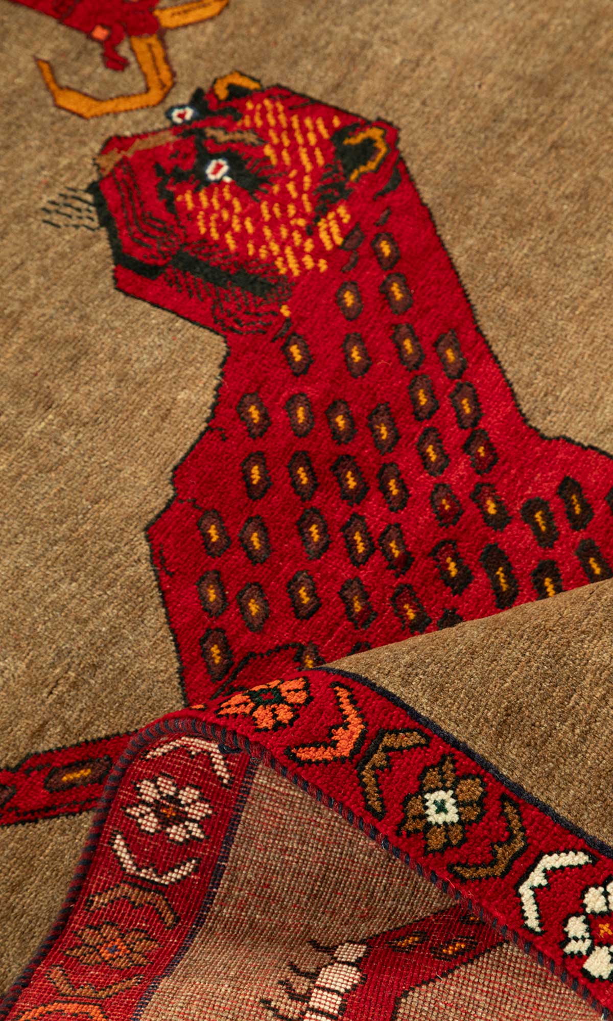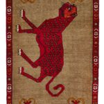Vintage Persian pictorial Gabbeh rugs are celebrated for their expressive, narrative qualities within the wider Gabbeh weaving tradition. Handwoven by tribal artisans from wool, they are characterised by bold, stylised depictions of animals such as lions, leopards, and other symbolic figures set against open, textured fields. The compositions are instinctive rather than precise, often featuring simplified forms and playful proportions that reflect the individuality of each weaver.