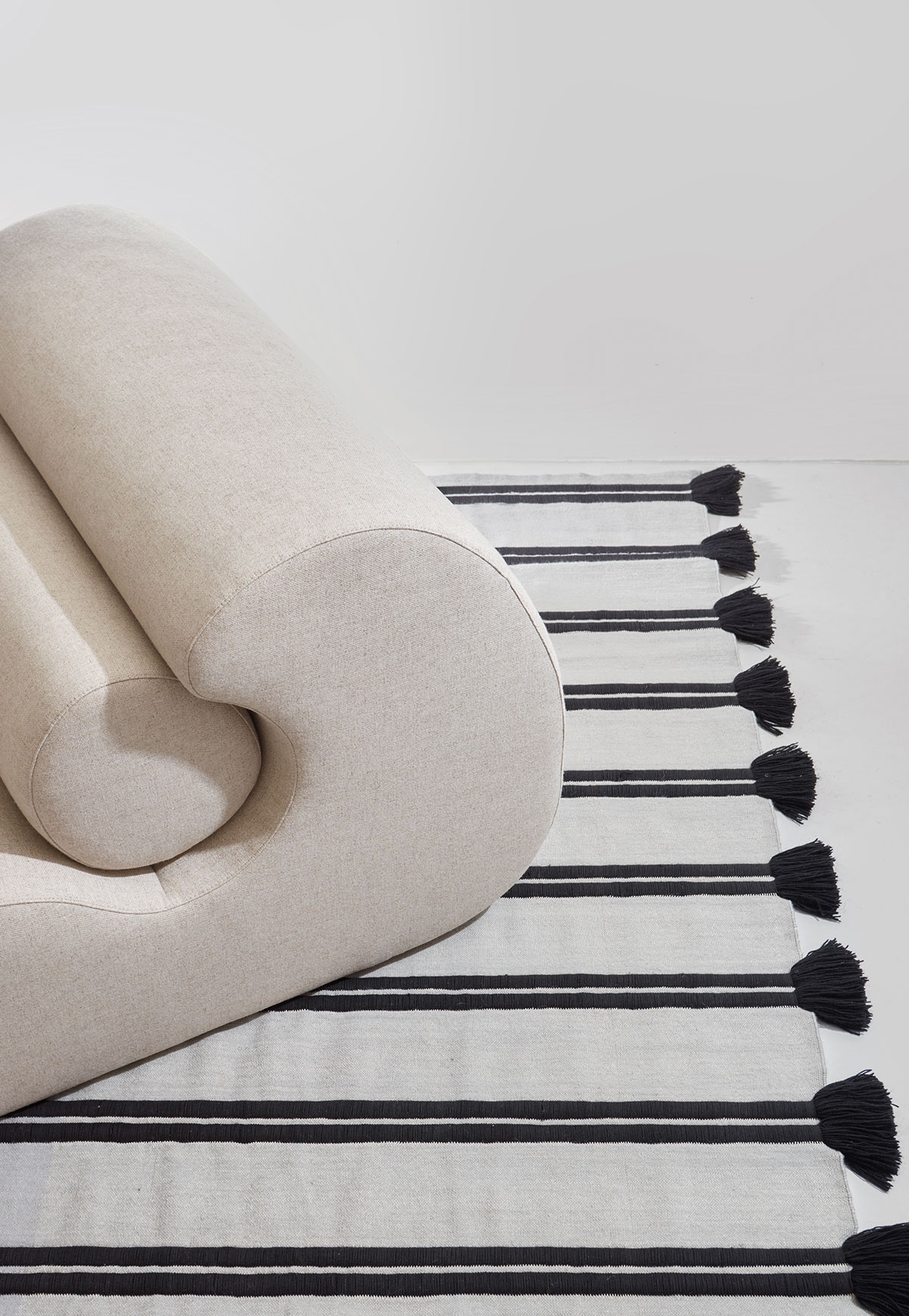 Through experimentation and research into materials and craftsmanship, an innovative combination of two weaving techniques was used; a rib weave and a double weave. The ribbed weave forms the protruding ribs, which, through the use of a large number of weft threads are then knotted to form the fringe detail. The flat stripes between are handwoven in a fine double weave, allowing for the texture and colour contrast to be possible. Handmade in India using high-quality wool yarn, the RIB collection is available in two sizes with three rib variants; fine, medium and double.