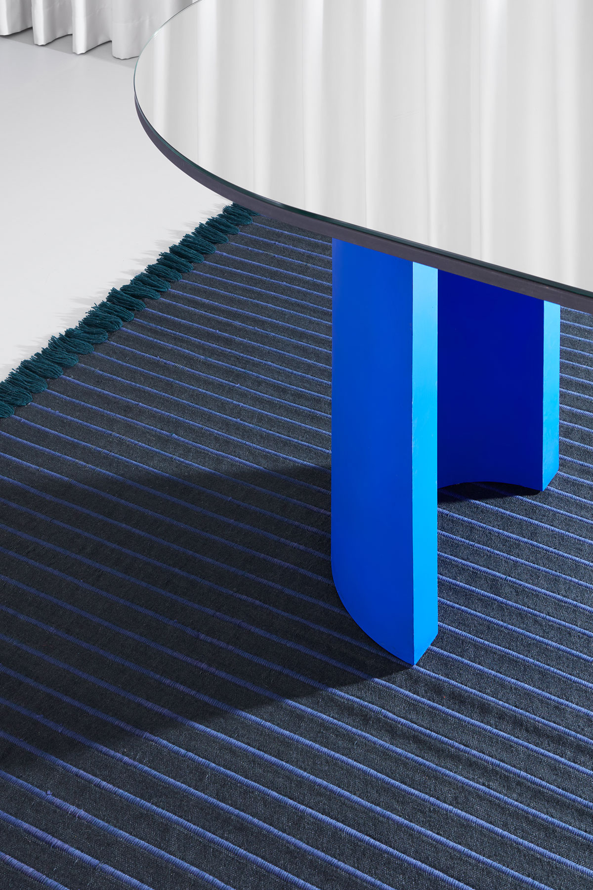 Through experimentation and research into materials and craftsmanship, an innovative combination of two weaving techniques was used; a rib weave and a double weave. The ribbed weave forms the protruding ribs, which, through the use of a large number of weft threads are then knotted to form the fringe detail. The flat stripes between are handwoven in a fine double weave, allowing for the texture and colour contrast to be possible. Handmade in India using high-quality wool yarn, the RIB collection is available in two sizes with three rib variants; fine, medium and double.