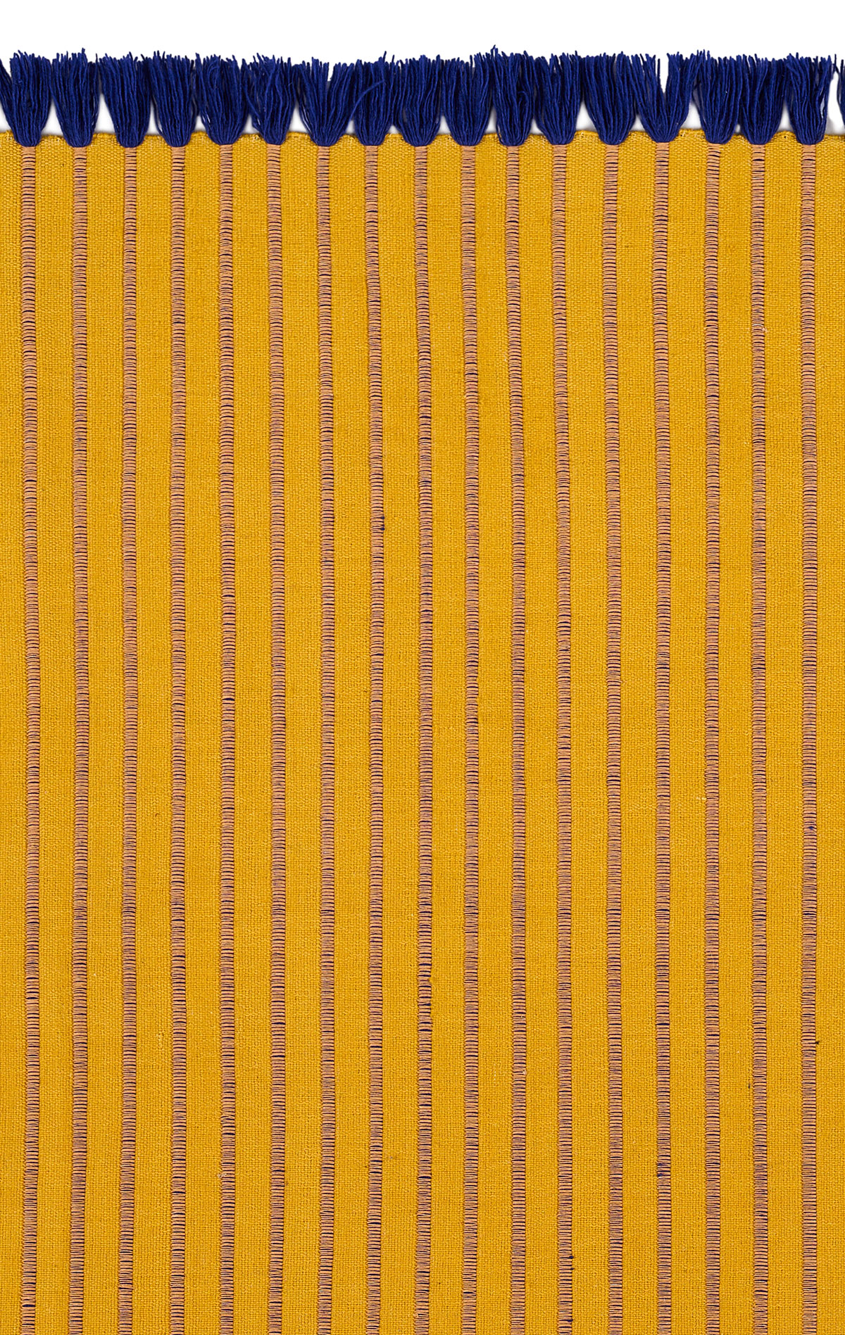 Through experimentation and research into materials and craftsmanship, an innovative combination of two weaving techniques was used; a rib weave and a double weave. The ribbed weave forms the protruding ribs, which, through the use of a large number of weft threads are then knotted to form the fringe detail. The flat stripes between are handwoven in a fine double weave, allowing for the texture and colour contrast to be possible. Handmade in India using high-quality wool yarn, the RIB collection is available in two sizes with three rib variants; fine, medium and double.