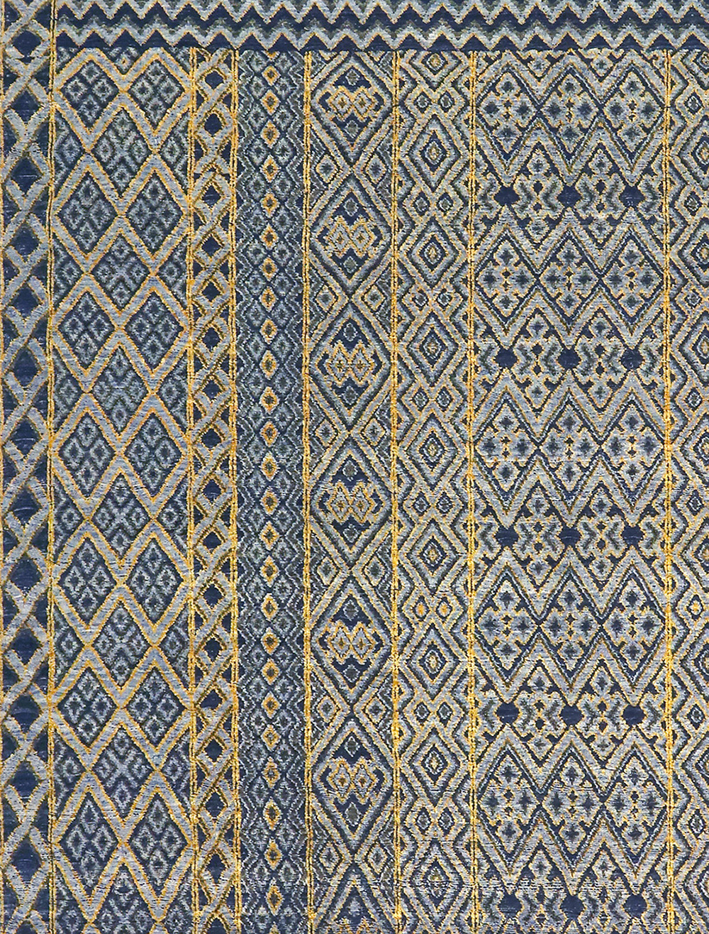 The collection draws inspiration from the designs of utilitarian mats carried around by one of the most resilient nomadic tribes of the Sahara desert: the Tuaregs. Traditionally, these mats are crafted using dried palm reeds and leather. Hand-knotted in the highlands of Afghanistan with hand-carded and hand-spun wool, the Sahara collection provides a contemporary interpretation of the Tuareg mats by exploring the traditional symbology of star and cross patterns with a palette of earthy tones and indigo that reflects its design narrative. The range took over three years to develop, prioritising sensitivity in its cultural designs and use of significant colours.