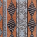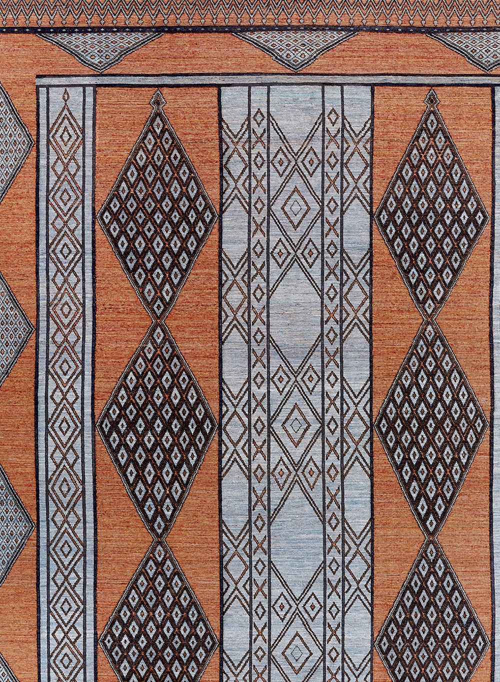 This collection draws inspiration from the designs of utilitarian mats carried around by one of the most resilient nomadic tribes of the Sahara desert: the Tuaregs. Traditionally, these mats are crafted using dried palm reeds and leather. Hand-knotted in the highlands of Afghanistan with hand-carded and hand-spun wool, the Sahara collection provides a contemporary interpretation of the Tuareg mats by exploring the traditional symbology of star and cross patterns with a palette of earthy tones and indigo that reflects its design narrative. The range took over three years to develop, prioritising sensitivity in its cultural designs and use of significant colours.