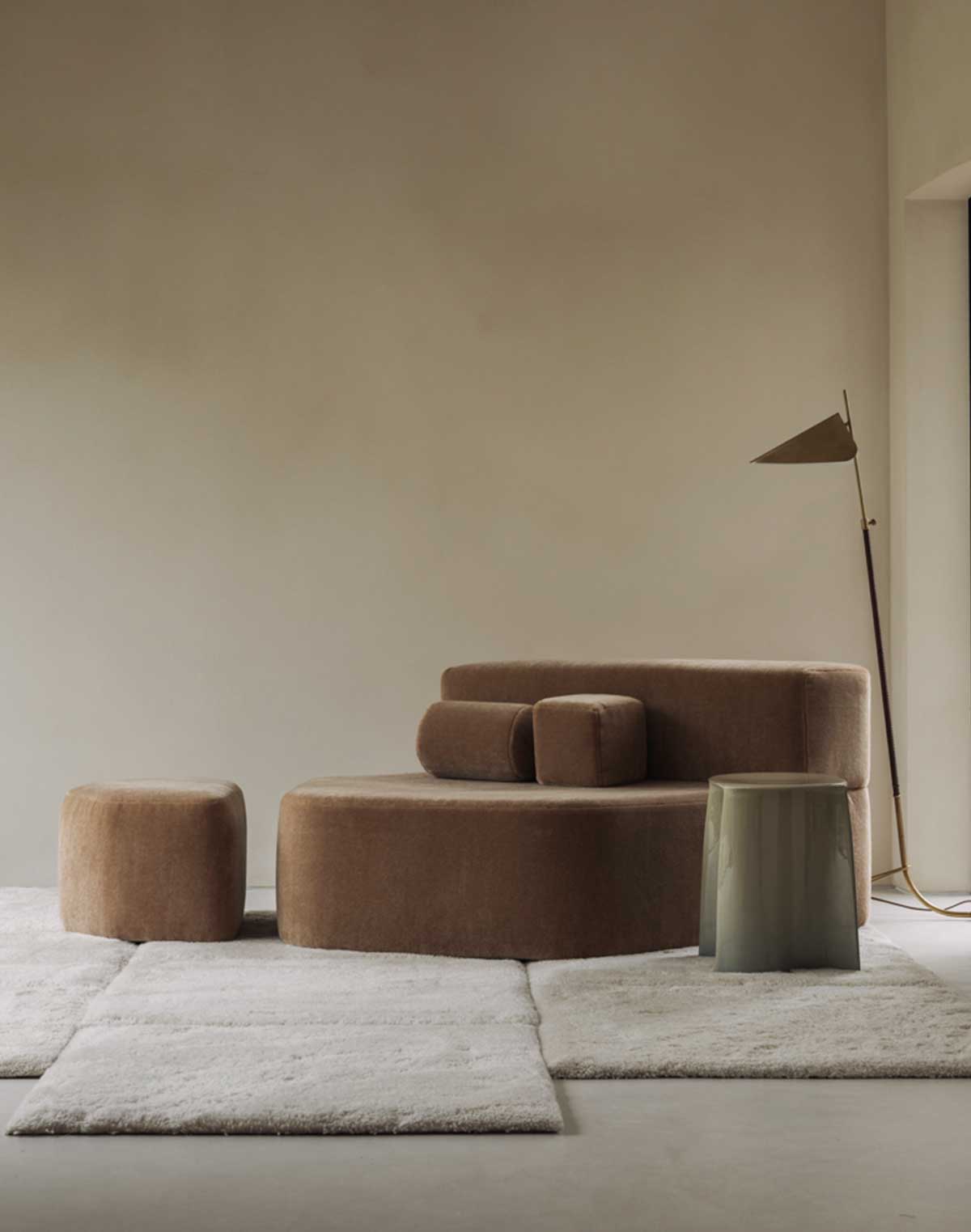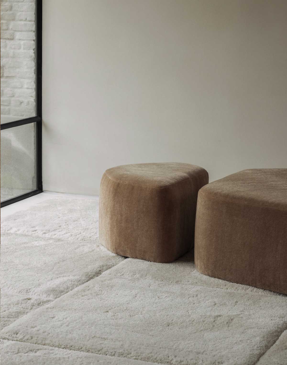 Tairu is distinguished by its modular tile-like construction where individual squares of plush wool are carefully assembled to form a cohesive and rhythmic surface. The resulting composition reads as a quiet mosaic, structured yet soft. Subtle variations in pile and texture add depth, encouraging engagement through touch while maintaining a composed presence. Tairu reflects JOV’s focus on material integrity and considered craftsmanship.