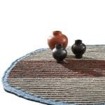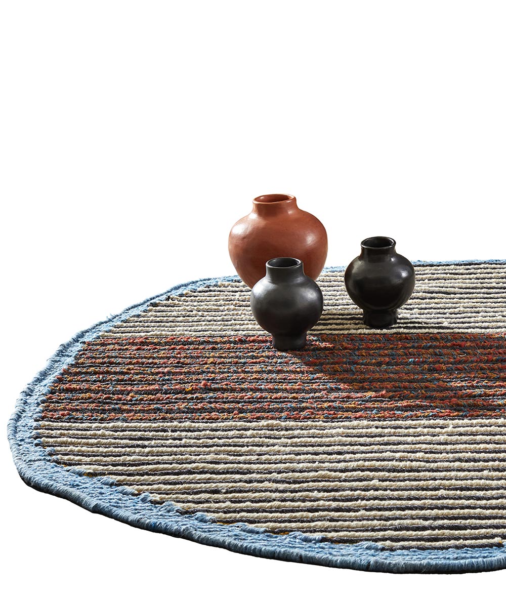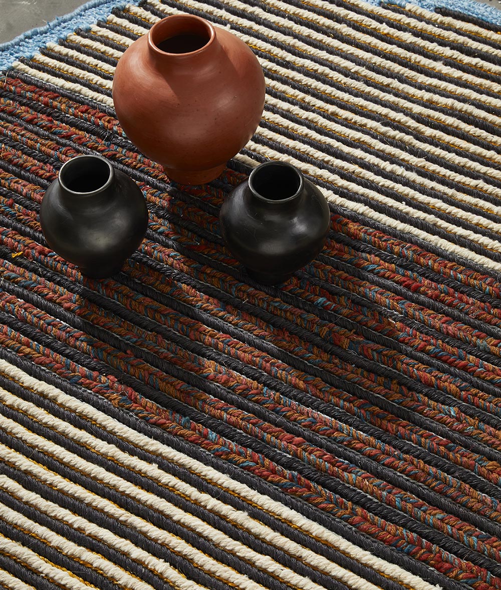 Designed by Mae Engelgeer, the Uilas collection takes inspiration from the landscape of the Colombian province of Huila. Referencing the interaction of two forces of nature: the river Rio Magdalena and the rough desert of Tatacoa in which the river flows through. In this collection, the use of natural sisal and the irregular edges of each rug represent the heavily eroded landscape found in the Tatacoa desert while the colourful wool stripes are reminiscent of the river running through the valley.
